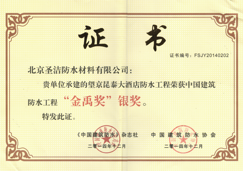 • 中國建筑防水工程“金禹獎”銀獎